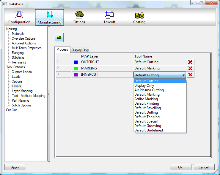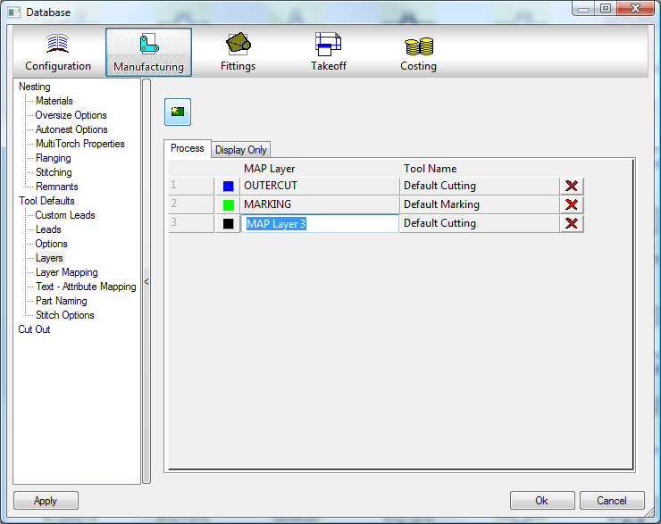 There are 2 types of layers that can be created - those that can be used in a process, such as cutting or marking, and those that are for display purposes only, such as development Line layers. On the Layers database dialog, click the Process tab or the Display Only tab to configure settings for each type.