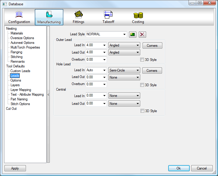 Leads are the pre-part and post-part cuts that ensure a smooth cut with no discernible start or end point. Lead styles are used when defining a part's cutting requirements in Profiler. The leads section allows for the editing of lead styles. Lead-in and lead-out lengths and types can be set for all types of islands. To access and amend these details Click on File