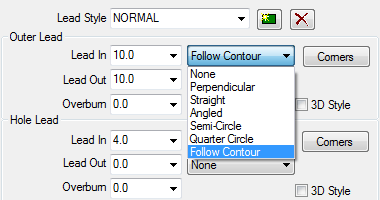 Each lead in / out can be defined as a particular lead type or as a created custom lead. Lead In is the length of cut that is made before the development is started. This can be set as a value or set to Auto.