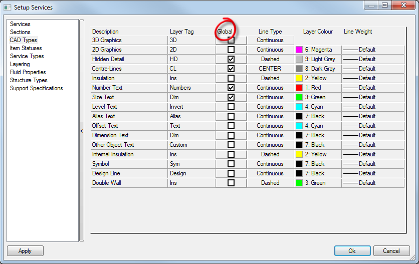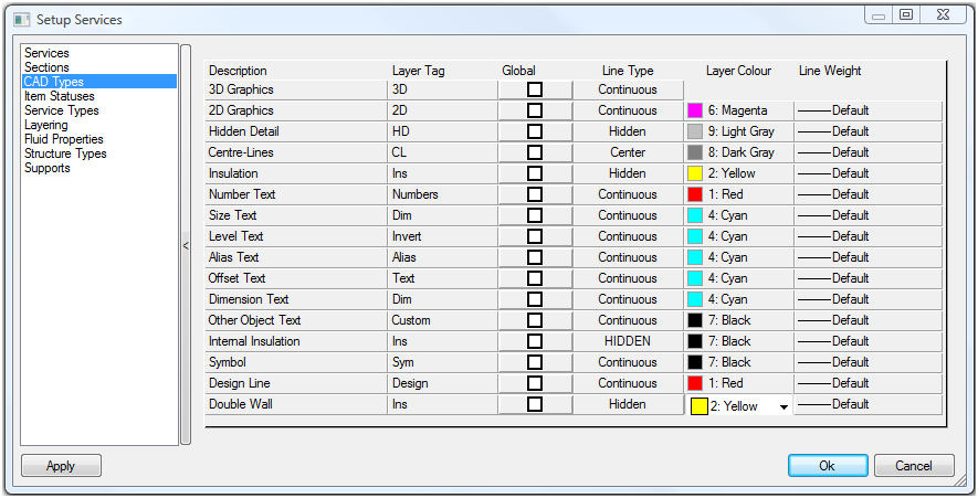 | Global | Activating the Global option for any of the CAD Types will force that particular type to Ignore all service layering setups. Instead ALL entries for that CAD Type will be placed on a layer whose name is taken from that CAD Types Layer Tag entry. Note: It is not recommended that either the 2D Graphics or 3D Graphics CAD Types are set to Global. |