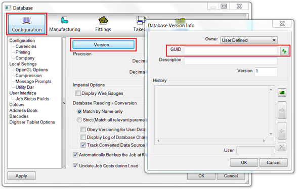 is green and enabled. However, on an owned database, such as any databases provided by Autodesk, or any manufacturer-supplied databases, the GUID cannot be changed. On these types of databases, the "Change to New GUID" button