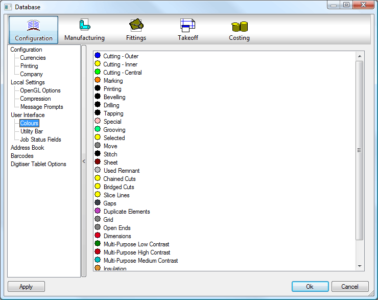 The user can define the colors that are used to highlight the graphics that represent operations within the program. Caution should be exercised when changing the color configuration as this can radically alter visibility of certain lines and objects.