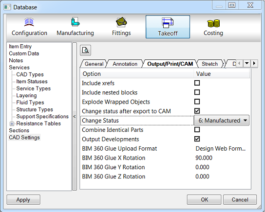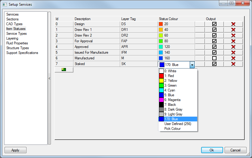 The Output option on the Item Statuses Database dialog allows the various Item Statuses to be marked as valid for output to CAM.