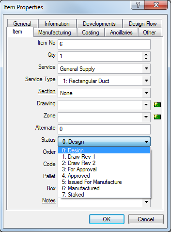 The Item Statuses dialog allows for the different stages of a model or job to be identified by its Item Status property. For example, an Item Status set to "Design" means that the drawing is still under construction. An Item Status of "Approved" could mean that the model has passes all checks and is ready to be sent on to production.