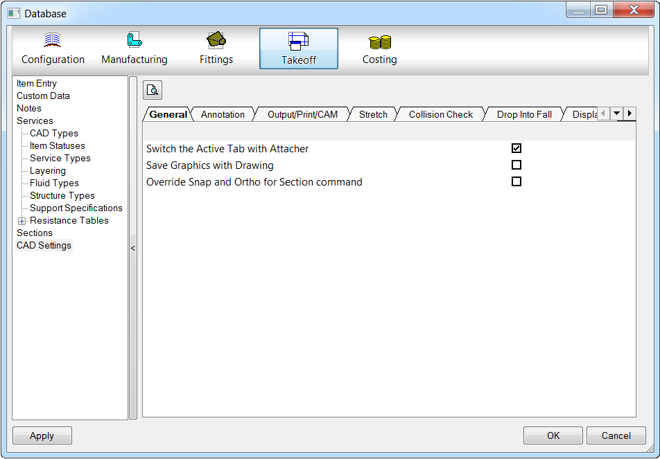 The CAD Settings section of the Database dialog controls various aspects of both the manufacture parameters and the drawing parameters of CADmep items. These are some of the primary settings used to manage the various aspects of how CADmep controls the drawing of items.