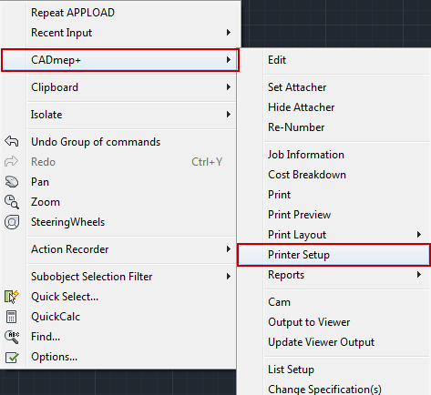 Printer Setup menu, and then selecting the appropriate printer type. In CADmep, access this from the right-click menu and select Printer Setup.
