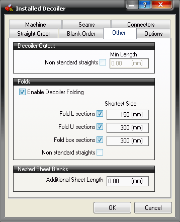The Folds section covers whether the Decoiler is set to do Decoiler Folding, and if so, what the minimum permissible shortest side length is for L sections, U sections, and box sections. Again non-standard straights can be included in this list.
