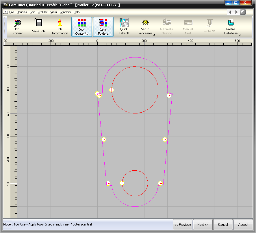 All of the islands should have been defined and the colors should confirm all of the Inner, Outer or Center Cut islands. Small yellow circles indicate where the default Lead Ins and Lead Outs have been placed. To confirm the Tool, Cut Type and Lead In details for any island, click with the left mouse button on any element included in the island. The island will be drawn in the selected color. The default color is yellow.