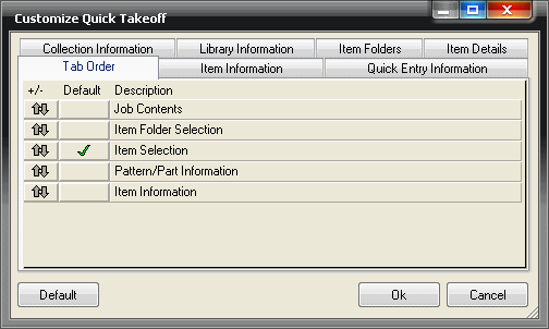 Quick Takeoff is an alternative way to the entry of data via Utilities > Job Contents as it shows you all of the relevant data on one screen. Also in the Quick Takeoff screen, you can customise the elements that will be available for entry on the Item tab of job entry. For more information on Quick Takeoff see Quick Takeoff.