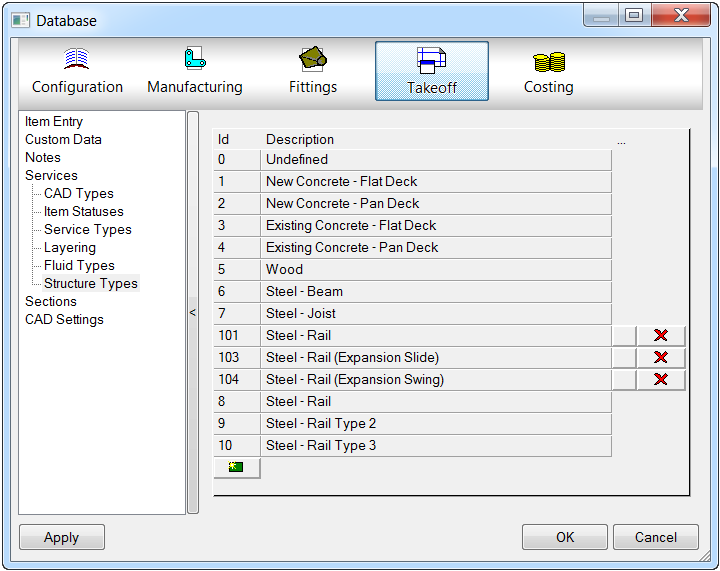 The Structures are setup in the Structure Types section of the Services Database, as shown below. Each service can be set to use a particular Structure Type at Takeoff. For more information, see Supports, Top Fixings tab.