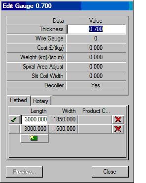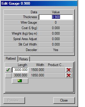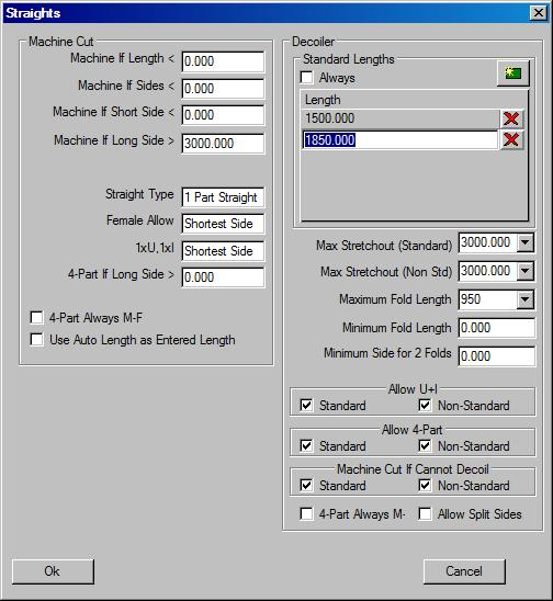 Set up the Straight options similar to what is shown below to allow the decoiler to use the two coils widths of 1500 and 1850 for standard straights. These will be made on Line 1. Straights that do match the two standard lengths will be made on Line 2.