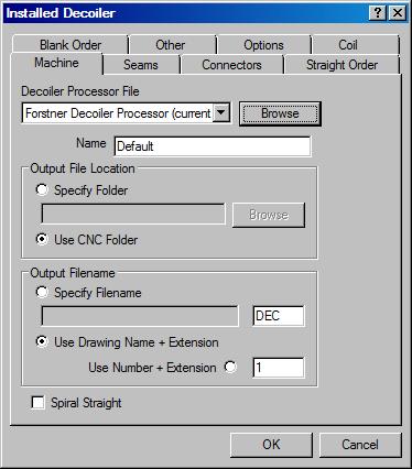 Setup a decoiler that uses decoiler post processor FORSTERNDPL.DPL. Click on the Browse button to locate the decoiler post processor file.