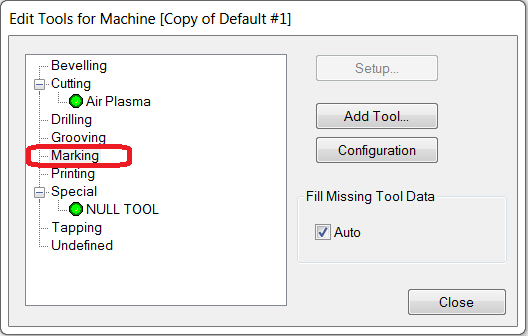 - On the Edit Tools for Machine dialog, highlight the marking tool just added, and click Setup. This displays the Tool Details dialog for the machine.