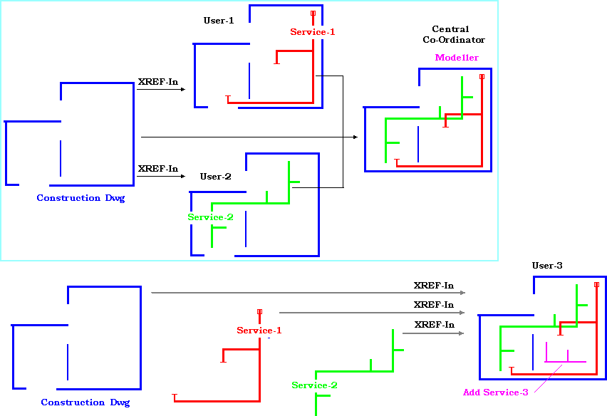 A combination of building services application packages, the AutoCAD 'xref' feature, and down-stream modeling packages make all this possible, as long as appropriate procedures are established and followed.