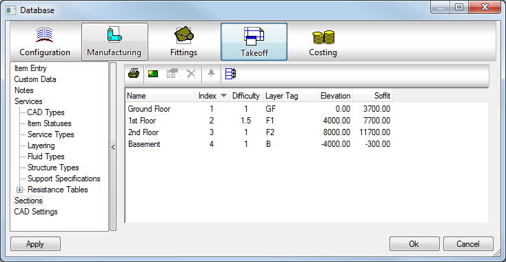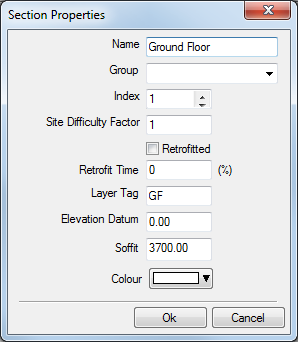 Soffit: Defines the Soffit height from which all Items drawn on this section will report the Levels to the Levels Annotation command i.e. If an Item is drawn physically at 4500mm from actual zero but placed on a section which has a Soffit value of 5000 the Levels command will report the level of the duct at 500.