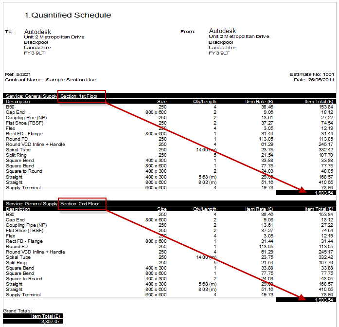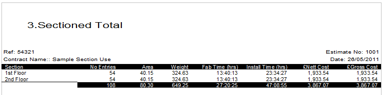The advantage of placing items within sections is for reporting to categorize the displayed information, allowing total weight for each section, section breakdown costs, and section labor time, as shown in the report examples below.