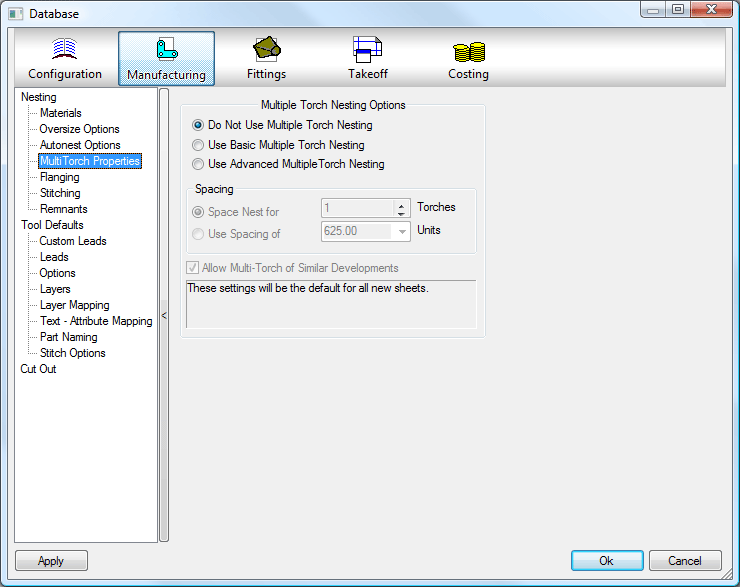 Space Nest for - Torches: Allows for a number of torch heads to be specified and then the largest part size is used as the spacing. The amount of spacing required can be printed on nest reports as "Sheet M-Torch Spacing".