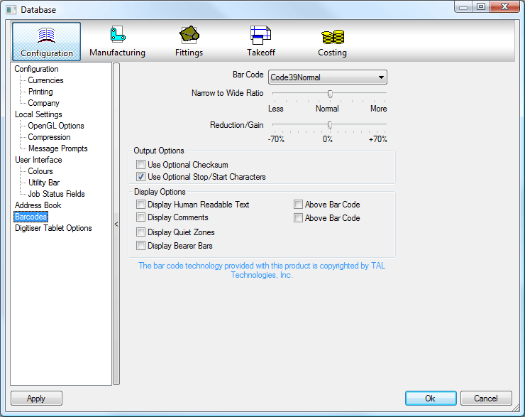 To configure a Fabrication product for use with Tracker and bar codes or QR codes, configure the Database Barcode options as described below.