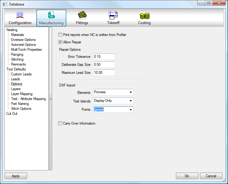 Profiler options sets the sensitivity of the auto repair function in Profiler. If parts fail to auto repair, you can set the values a slightly higher, although caution must be exercised if deliberate gaps are to be preserved. To access and amend these settings, click on File Setup Database and select the Manufacturing Options section.