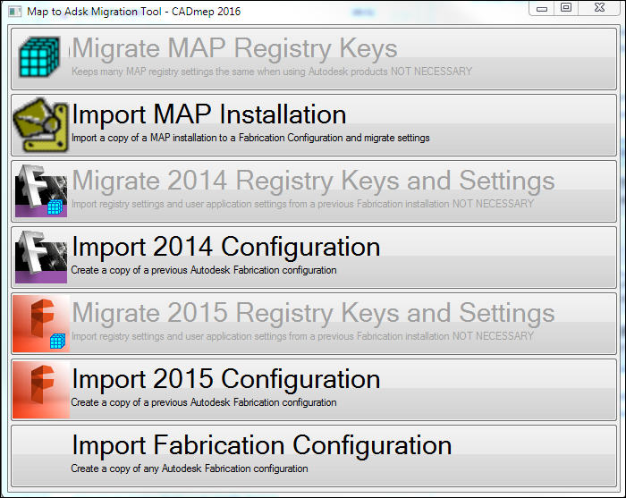 | Migrate <2014 or 2015> Registry Keys and Settings | Clicking this option imports registry settings and user application settings from version 2014 or 2015 Autodesk Fabrication products. CAUTION: As soon as you click this option, the migration occurs. |