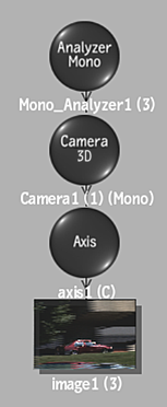 In the schematic view, you can see that an Analyzer node is added to the scene. The number in brackets next to the name of the Analyzer node indicates the media used for the analyzer (a zero (0) indicates Back media). The Analyzer node is parented to a 3D Camera node, which is synced to the analysis of the Analyzer node, as well as an Image (or Stereo Object) node with an axis.