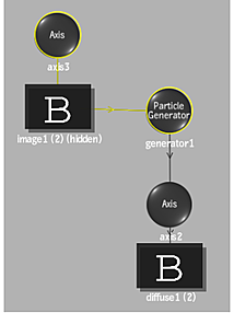 A diffuse object appears in the schematic and is parented by the particle generator. See Diffuse Mapping.