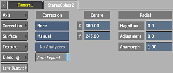 The Lens Distort tab settings are the same as in the Object Image menu for non-stereo objects. See Lens Distort Settings.