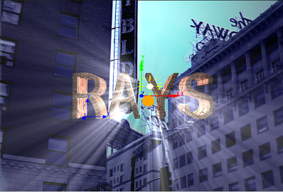 You can position rays behind 2D or 3D objects to generate effects, although rays are still visible even without an object to outline them. When semi-transparent objects are positioned in front of the light, it is possible to generate volumetric rays that use the colour of the object.
