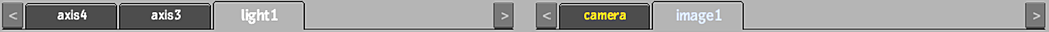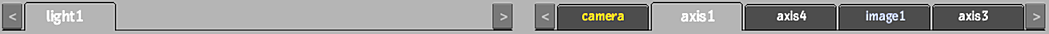 The tabs in the Object menu appear as follows. The image1 tab appears in light blue to signify that multiple objects are connected down to it. Use the tabs to switch between menus within the Object menu. The Camera tab appears in orange as the first tab on the right side of the Object menu, and is exempt from the tab population rules.
