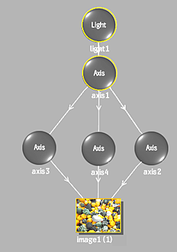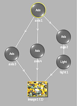 These objects include generators, bouncers, deformations, surfaces, texture maps, shadows, geometries, and 3D text. When one of these objects is selected in the schematic, an ascending (bottom-to-top) scanning of branches is performed. The hierarchical scanning stops for any given branch when an axis or object with axis attributes is encountered.