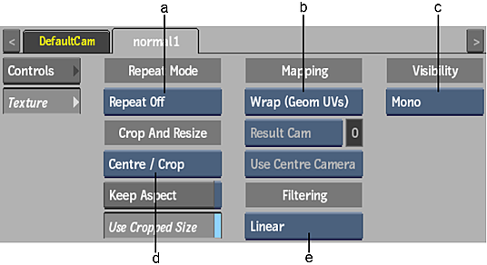 (a) Repeat Mode box (b) Mapping box (c) Camera Type box (d) Fit Method box (e) Filter box