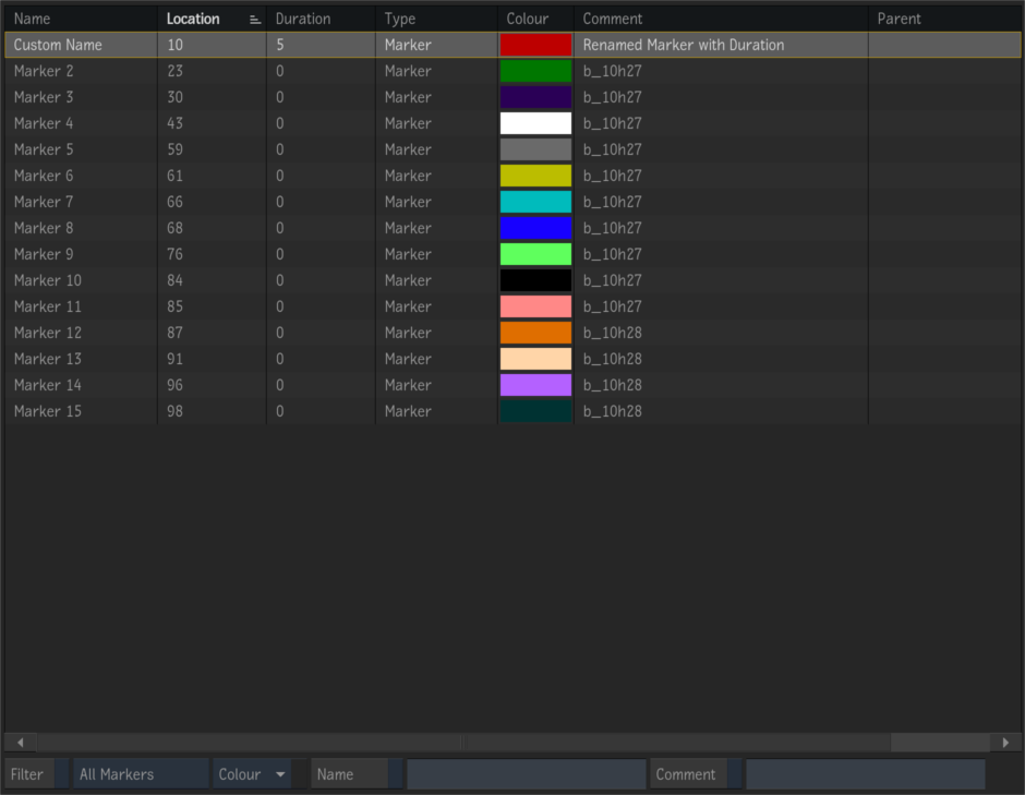 From the Markers view, you can organize your Markers, by naming them, assigning them a colour and a comment. The following information is displayed in the Markers view: