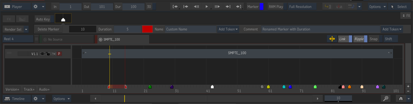 You can assign a duration to a Marker or a Segment Marker. The duration can be set using the Duration numeric field in the Timeline Markers menu or the Markers view.