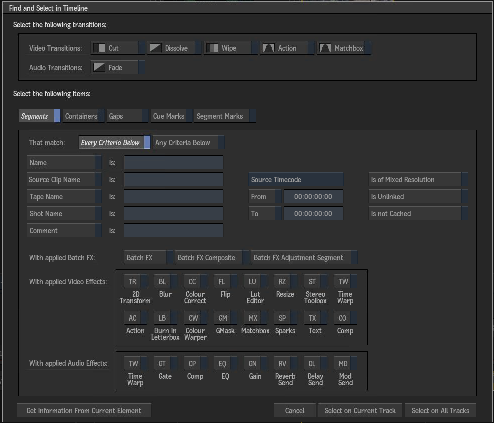 Although you can search for elements by scrolling the timeline and displaying information about each element, the Find and Select in Timeline options make it easier to find specific elements. You can also refine your search when searching specifically on segments. Once your search is complete, or if you have multiple segments selected on the timeline, you can easily navigate through them.