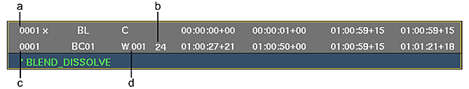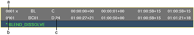 Dissolves are represented in the EDL by two consecutive edits with the same event number. The first edit represents the outgoing shot of the dissolve and the second edit represents the incoming shot of the dissolve. The dissolve is listed in the Transition column of the second edit as D n (where n is the transition duration).