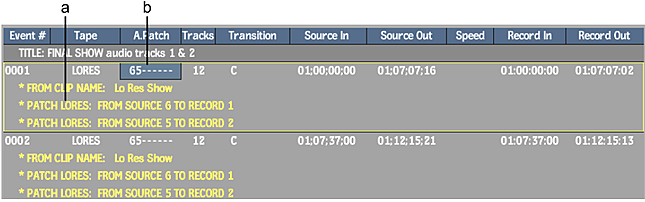 The source tracks that have been patched to different audio tracks than the defaults are indicated in the affected event's Audio Patch Field. Dashes in the Audio Patch Field indicate the track is patched to its default. Comments are also added which indicate the name of audio tracks and their patching information.