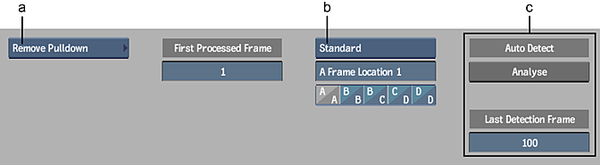 When removing a pulldown, you can analyse the clip to automatically detect the type of pulldown and the A frame. If the analysis fails to determine the type of pulldown or the location of the AA frame, manually set the Pulldown and the A Frame Location options.