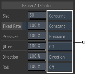 - Uses the direction of the brush stroke as the reference. When used with the Direction mode, the Direction attribute causes the brush strokes to follow the trajectory of the brush. Increase the value to enhance the effect on brush direction. Drag right to use 100% of the brush attribute value, left to use 0%, up to use 25%, or down to use 75%.