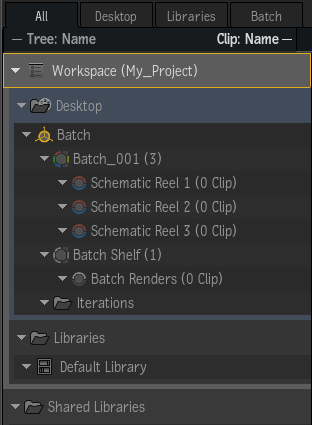- Displays each instance of Batch, along with their schematic reels, shelves, and iterations. While Flame Assist does not have an explicit Reels view on the Desktop, it nonetheless maintains the Reels structure from material imported from Flame, in the Media panel.