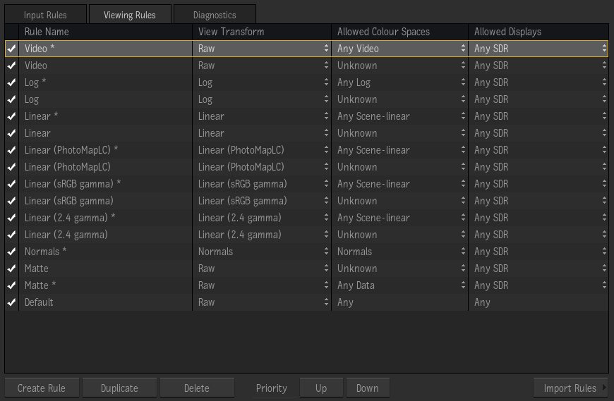 Viewing Rules that are organized higher in the rules table take precedence over lower ones. For any given tagged colour space and display, the highest priority rule is called the Primary Viewing Rule. The Primary rule is the one that is used by default.