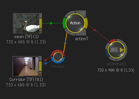 The following example displays indirect media in Action. The swan clip is attached to the Action node as the back clip, whereas the Corridor clip is attached to an Action media node as the front and matte media.