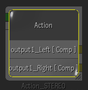 The node is renamed to Action_STEREO, the output tabs display the left eye and right eye outputs, and all stereo settings are automatically set.