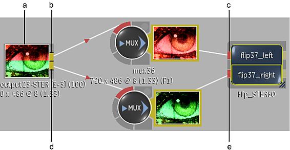 (a) Clip containing stereo track (b) Left eye output tab (c) Left eye input tab (d) Right eye input tab (e) Right eye output tab