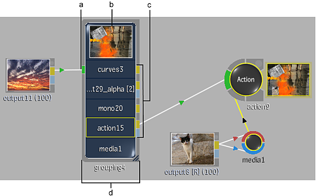 (a) Input connection (b) Proxy window (c) Output connections (d) Group icon