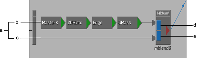 The Front and Matte pipes of the MBlend node are both designed to result in a matte. This is represented visually by a blue box at the right of the Front and Matte pipes. You can place any node on the Front and Matte pipes that results in a matte, including the MasterK, 2D Histogram, GMask, Edge and Degrain nodes.