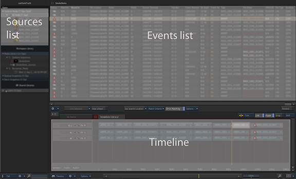 - Displays the events that make up the sequence displayed in the Timeline area. Selecting an event in the list also selects it in the Timeline. You can sort the list using by clicking the column headers. Linked events are usually displayed, but if you are only interested in unlinked events, you can hide the linked events from the Display Options box. If the Events list displays the message All Sources Linked, the selected sequence is already conformed.