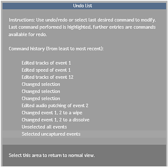 Use the Undo List to view all modifications (up to the number of undo levels specified in the Preferences menu)that you made in the current session and undo a single or series of commands.