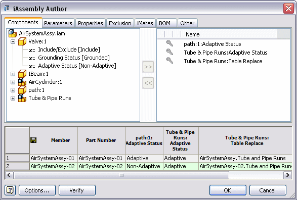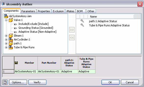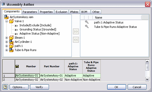 - After you have completed all other Inventor iAssembly properties, click Verify to validate the assembly configuration. For instance, a master runs assembly member can only be Adaptive once in the iAssembly factory and the BOM Qty column can only contain a number or a string of Default.