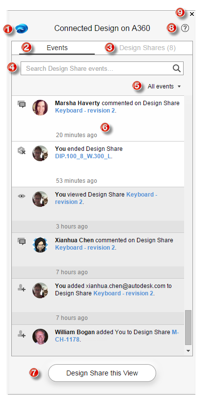 displays all Design Share events for all your Design Shares that you own and are a collaborator of. An event is any action performed by you or by your collaborators with whom you share Design Shares. Incoming and new events display with a white background.