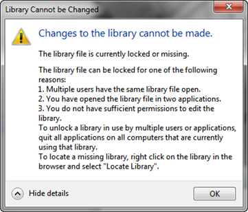 - From within the Material or Appearance Browsers, If you open a library and its copy in the same session, this error message displays: